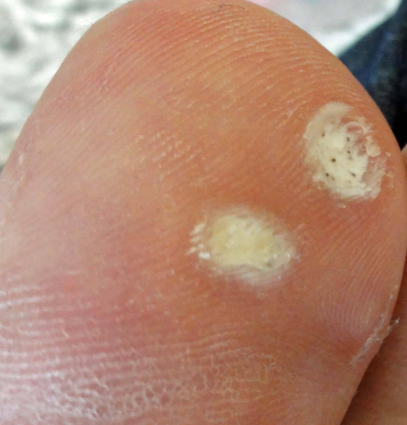 - tvorbou ložísk najmä v záhyboch (lakťové a kolenné jamky, krk)